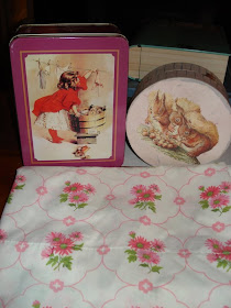 I know, I'm suppose to be working, but I couldn't help it....I had to go to the bank. And since I was already over in that direction.... I figured I'd pop in to the thrift store to see what I could find.... Don't worry, I only spent $2!! The tin on the right reminds me of a picture of my mother when she was little. She was probably 5, and she was hanging up her doll clothes on the line.... The paper mache' box with the squirrels was also too cute to pass up. Both were $.45!! Then in front is a pillow case! That was $1!! I love girlie pillows!! And I could not pass up those pink flowers!